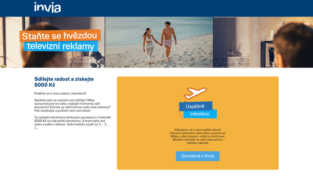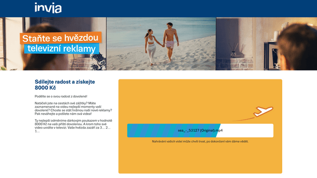 Microsite byla součástí kampaně Moje dovolená pro cestovní kancelář Invia. Cílem bylo poskytnout nástroj pro bezproblémový a bezpečný upload zákaznických videí se zážitky z dovolených a zároveň připravit přehledný výstup pro snadné zpracování nahraného obsahu.