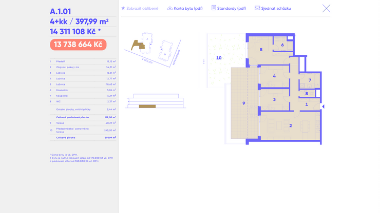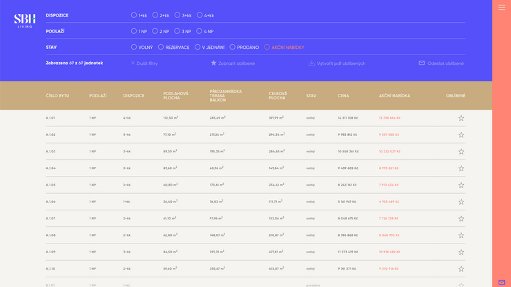 Na tento model navazuje také kompletní výpis všech bytových jednotek, pro který jsme implementovali pokročilou filtraci. Jednotlivé byty lze přidat do seznamu oblíbených bytů a následně z něj vytvořit pdf soubor, který je možné rovnou odeslat na libovolný e-mail. To vše na jednom místě.