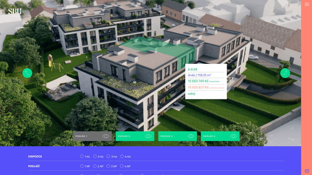Hlavní a nejdůležitější část webu je interaktivní 3D model bytů. Díky implementaci tohoto modelu je možné jednoduše zobrazit celý komplex ze čtyř pohledů a po najetí na jednotlivé byty jsou k dispozici základní údaje o konkrétním bytu.